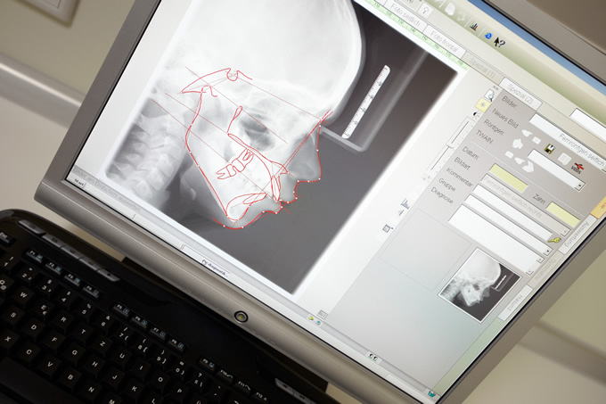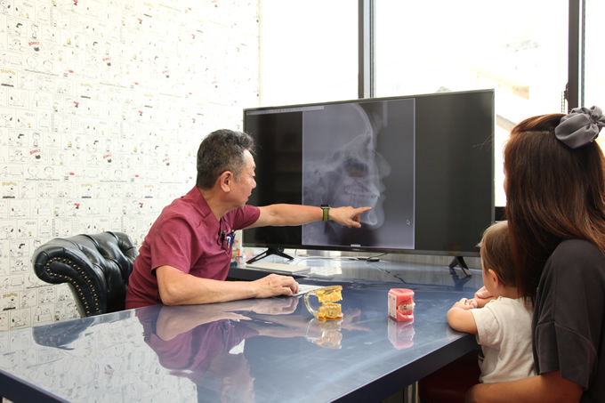 また、顔貌の正面写真、横顔等の写真を撮影し、顎関節の状態や噛み合わせ等も同時に検査します。