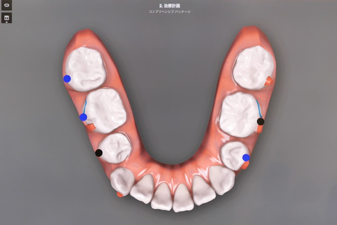 この診査・診断項目は多岐にわたり、精密検査をもとに担当医の矯正治療経験、最新の矯正知識をもとに治療計画を立案します。その他、マウスピースの枚数やアタッチメント種類、アタッチメントの装着位置、歯の誘導方法などの治療計画も同時に作成します。